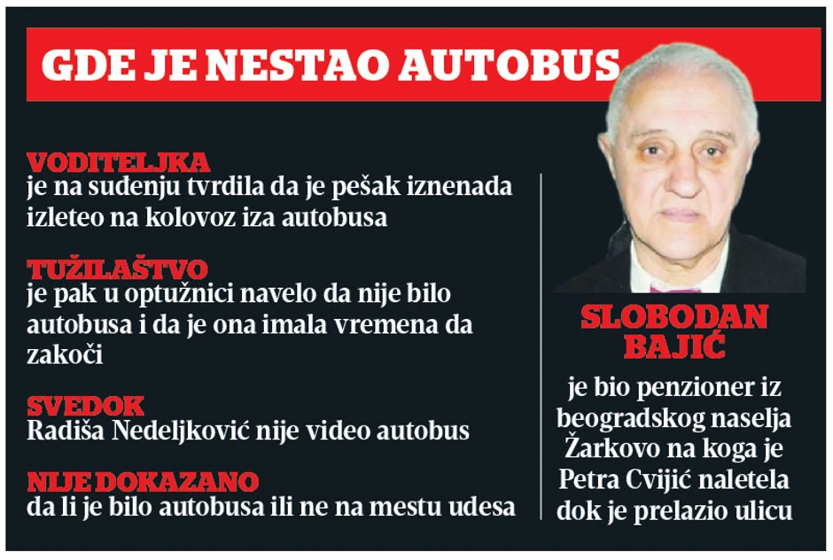 U prvoj optužnici koju je tužilaštvo podiglo protiv Petre Cvijić navodilo se da je ona Bajića udarila na pešačkom prelazu. Posle saobraćajnog veštačenja, kojim je utvrđeno da Bajić nije bio na pešačkom prelazu u trenutku udara, i dopunskog veštačenja, koje je to potvrdilo, tužilaštvo je izmenilo optužnicu i navelo da pešak nije bio na zebri, ali da je okrivljena Cvijićeva bila dužna da obrati pažnju na njegovo kretanje.