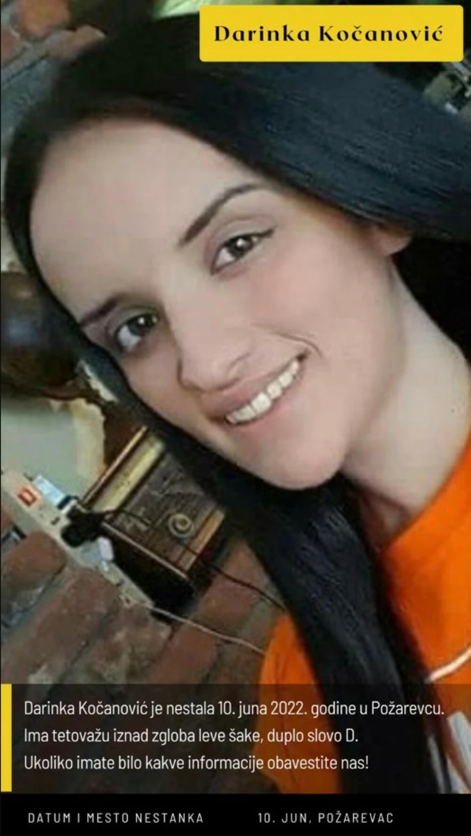 Darinka Kočanović (23), čiji je nestanak objavljen na stranici "Nestali Srbija" uz objašnjenje da se o njoj ne zna ništa već šest dana, bila je na izdržavanju kazne u zatvoru u Požarevcu.