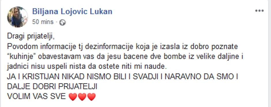 - Dragi prijatelji, povodom informacije, to jest dezinformacije, koja je izašla iz dobro poznate “kuhinje” obaveštavam vas da jesu bačene dve bombe iz velike daljine i jadnici nisu uspeli ništa da oštete niti mi naude. Ja i Kristijan nikada nismo bili u svađi i naravno da smo i dalje dobi prijatelji. Volim vas sve - objavila je Lukan na svom profilu.