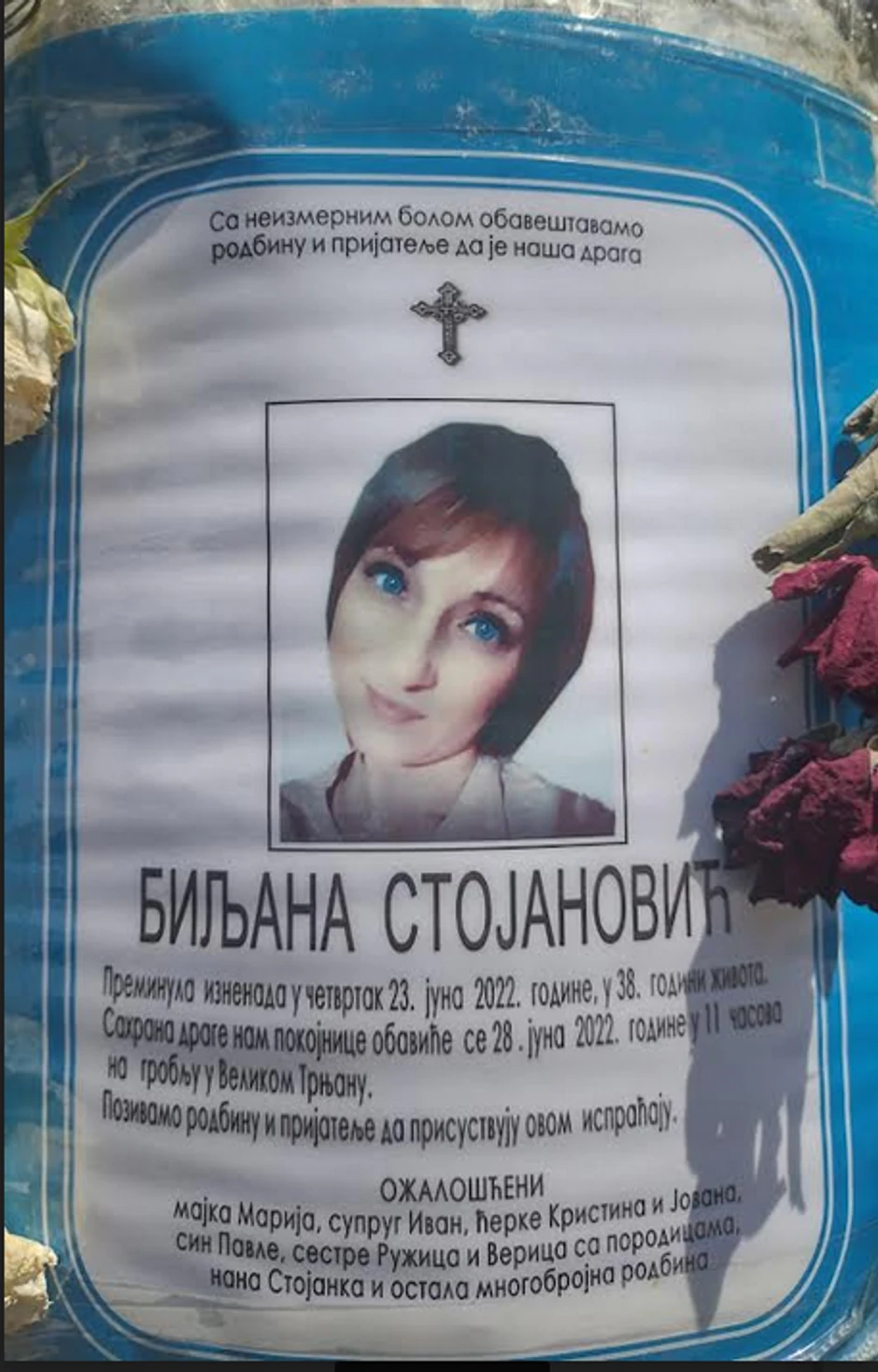 Na umrlici Biljane Stojanović, žene koja je pre nekoliko dana pronađena mrtva u pomoćnoj zgradi u svom dvorištu u selu Veliko Trnjane kod Leskovca, kao ožalošćen naveden je njen suprug Ivan Stojanović, za koga je na dan njene sahrane otkriveno da ga je ona ubila i zabetonirala?!