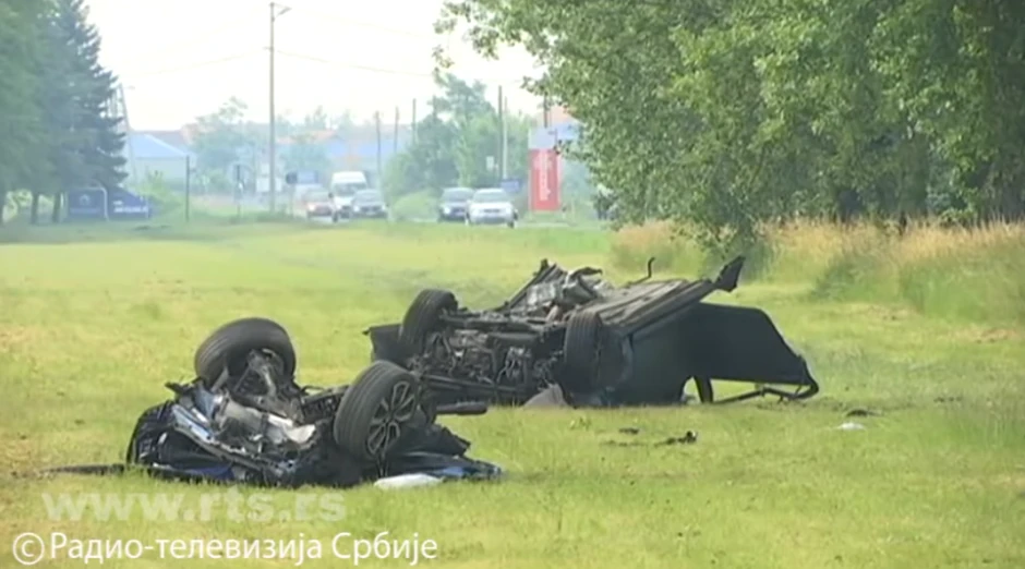 Udarac je bio toliko silovit da se automobil prepolovio, a delovi vozila rasuti su po travnatoj površini.