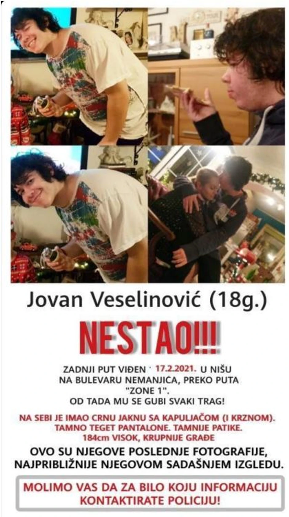 Jovan Veselinović (18) koji je nestao 17. februara u 23 sati na Bulevaru Nemanjića u Nišu još nije pronađen, a policija, porodica i prijatelji za njim intenzivno tragaju već treći dan.