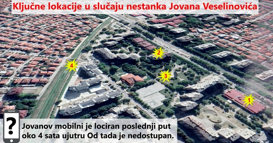 Ako ste se kretali ovim delovima Niša u to vreme u sredu uveče, i ako se setite da ste slučajno videli nestalog Jovana Veselinovića, molimo vas da to prijavite policiji i na taj način pomognete u Jovanovom pronalaženju i bezbednom povratku kući.