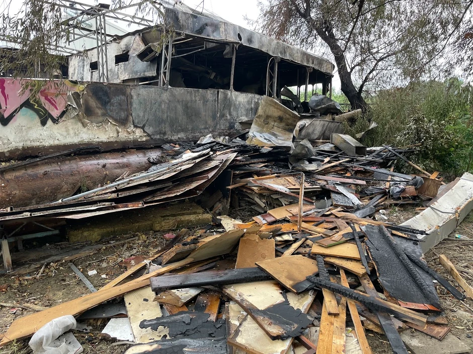 Prema fotografijama jasno je da od objekta nije ostalo puno i da je svuda pepeo i garež kao i delovi splava.