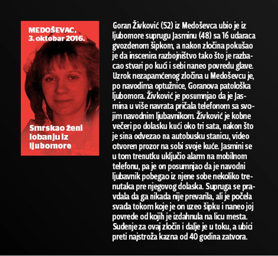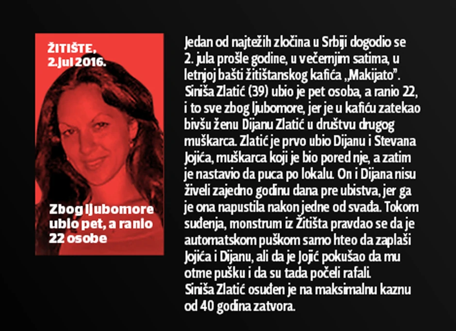 Ubistva iz strasti su ubistva iz ljubomore, kaže kriminolog Dobrivoje Radovanović, a takvih ubistava je poslednjih godina sve više. Javnost je ostala nema kada je prošog jula Siniša Zlatić (38) iz Žitišta nakon što je video svoju bivšu ženu Dijanu Zlatić (30) u lokalnom kafiću sa drugim muškarcem počinio petostruko ubistvo i ranio 22 osobe. I sve to zbog ljubomore.
