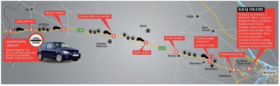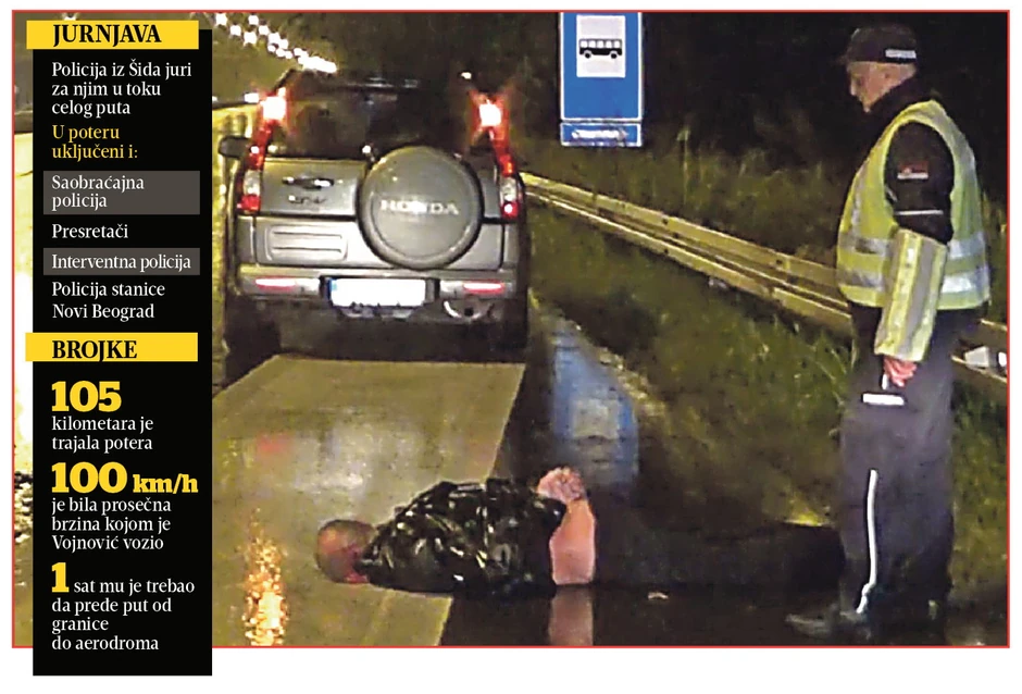 Hrvatski državljanin je zatim počeo da juri u pravcu Beograda: vozio je brzinom i do 100 kilometara na sat, što je bilo veoma rizično s obzirom na klizave kolovoze. Graničari su odmah potom javili policiji da krene u poteru za Vojnovićem, pa je pripremljena i blokada autoputa u kojoj su policijska vozila zakrčila sve trake autoputa. Nezvanično, pet policijskih ekipa - novobeogradska, šidska i saobraćajna policija, presretači i vod interventne policije - napravilo je levak nasred puta. Kroz njega su selektivno propuštana vozila, a sedam od njih oštećeno je kad je Vojnović pokušao da probije kordon!