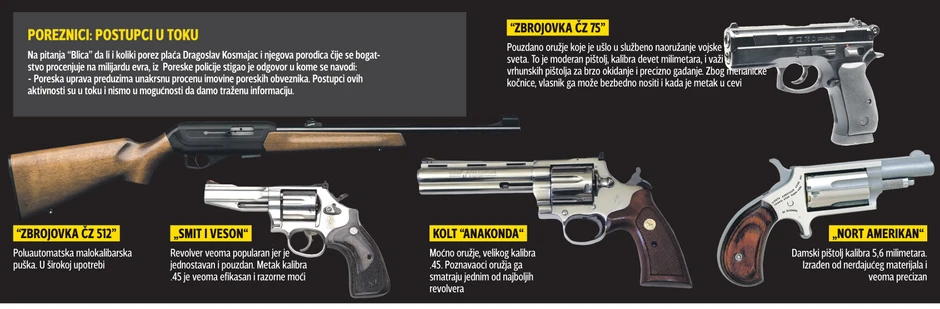 Tada su nađeni malokalibarska puška “zbrojovka ČZ 512” i pištolj “zbrojovka ČZ 75”, oba na ime Lazar Kosmajac, kao i revolveri koji se vode na njegovu majku Aleksandru: revolver „smit i veson“, „nort amerikan“ i kolt “anakonda“.