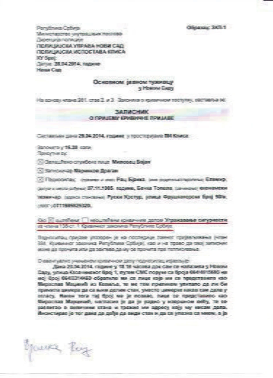 - Prvo sam otišla u novosadsku policiju jer Miroslav M. živi u tom gradu. Ali, oni su me uputili kod kolega u Kać. Međutim, u Kaću su se čudili zašto nisam prijavila pretnje tamo gde sam ih i dobila, odnosno u Novom Sadu. Onda je usledio novi šok - policajci su mi rekli da se obratim policiji u Kuli, jer sam se sklonila kod roditelja u Ruski Krstur - revoltirana je Bjanka Rac čiju su prijavu na kraju primili novosadski policajci.