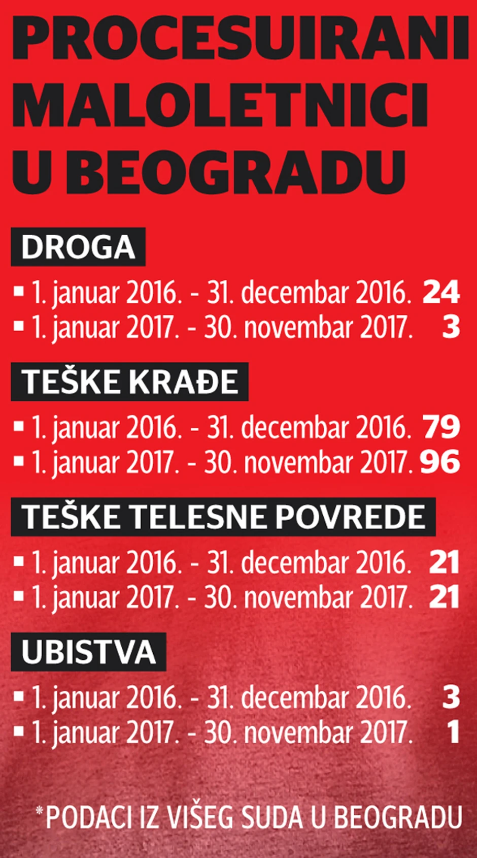 Prema podacima iz Višeg suda u Beogradu, tokom 2016. godine zbog neovlašćene proizvodnje i stavljanja u promet opojnih droga pokrenuta su 24 postupka protiv maloletnika. Međutim, za 11 meseci prošle godine broj maloletnika koji su procesuirani je znatno smanjen, odnosno postupak je pokrenut protiv tri maloletnika.
