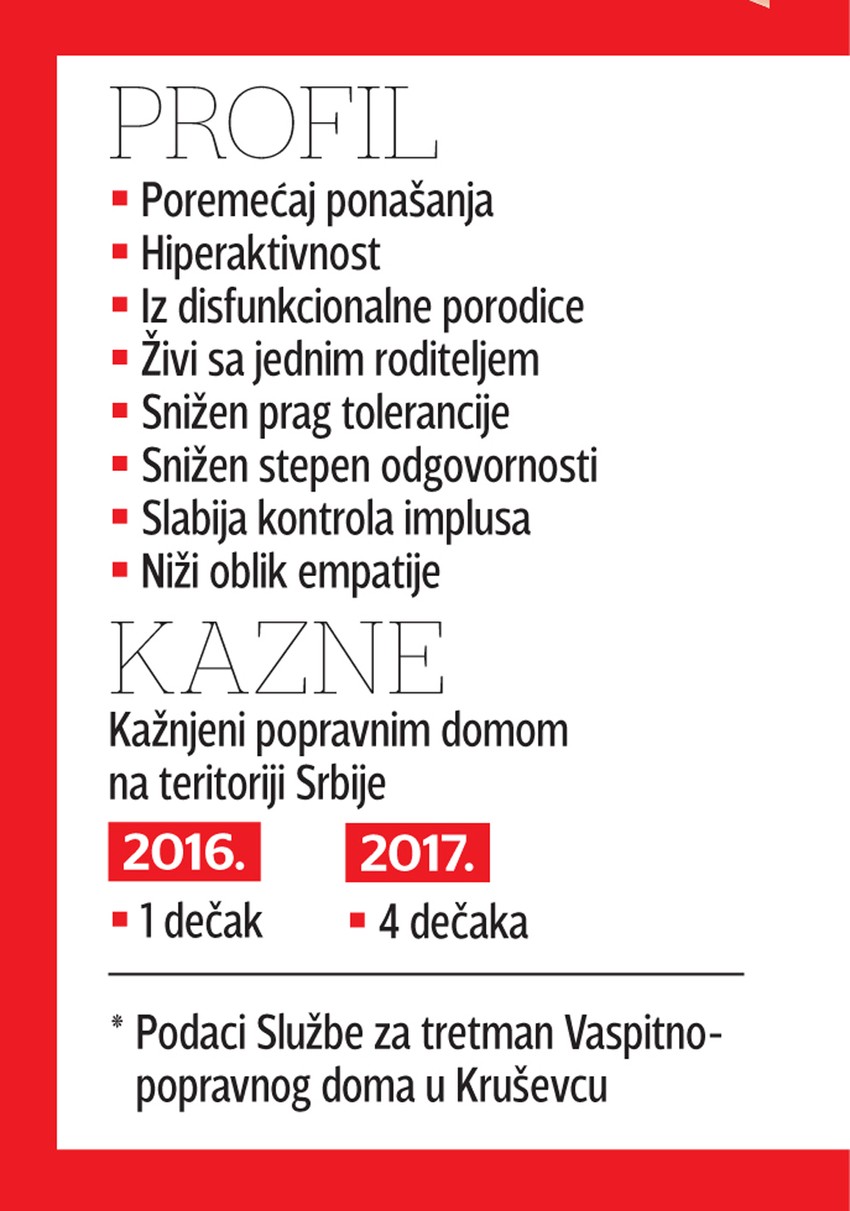 - U ovakvim slučajevima uglavnom se radi o vršnjačkom nasilju. Potiču iz disfunkcionalnih porodica, najčešće nepotpunih, gde žive sa jednm roditeljem. Prag tolerancije na frustraciju je snižen, kao i stepen odgovornosti. Slabija je kontrola impulsa, konflikata i agresivnosti. Niži oblik empatije - navode u Uprave za izvršenje krivičnih sankcija.