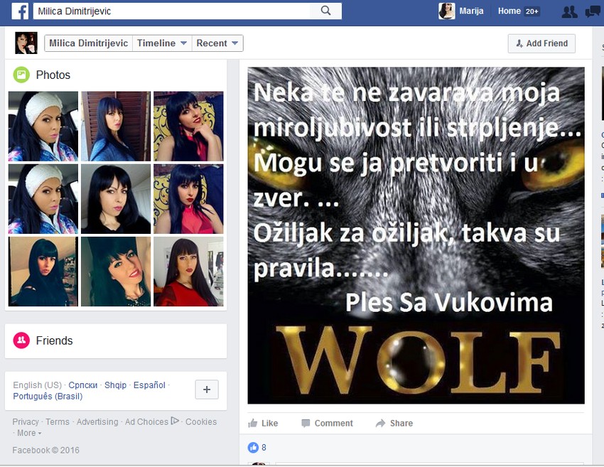 "Nek te ne zavarava moja miroljubivost ili strpljenje... Mogu se ja pretvoriti i u zver... Ožiljak za ožiljak, takva su pravila..." - objavila je ona sa fotografijom vuka.