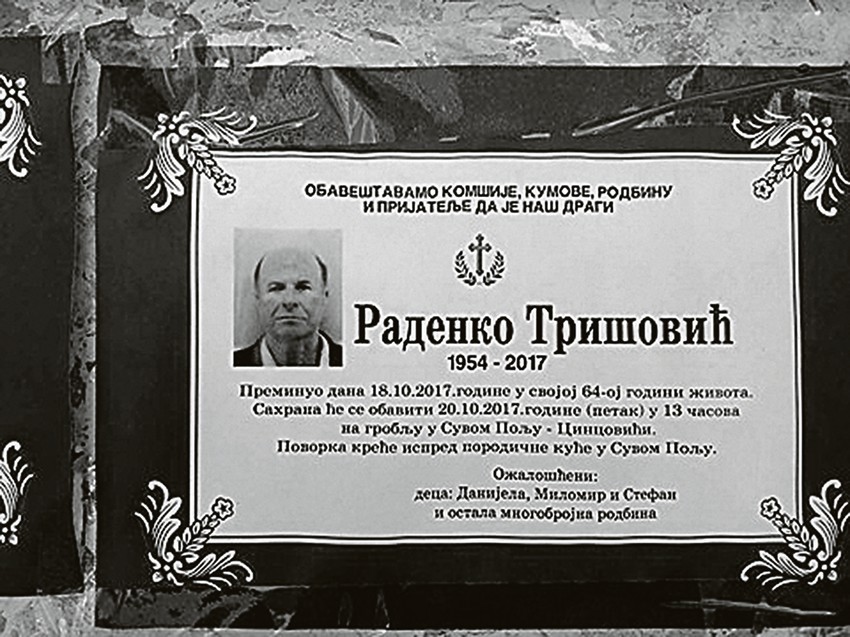 Radenko Trišević (63) iz Suvog Polja kod Priboja, koji je pretprošle noći teško ranio suprugu od koje se razveo, njenu sestru, bivšeg pašenoga i taštu, a potom izvršio samoubistvo, ostavio je oproštajno pismo.