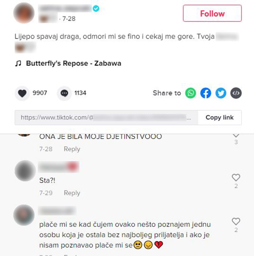 Na sve komentare o njenoj smrti, i oproštajne poruke, uključivao se i trinaestogodišnjak iz Pljevalja. On je ostavljao komentare poput "Dušo" ili "imajte malo poštovanja za nju".