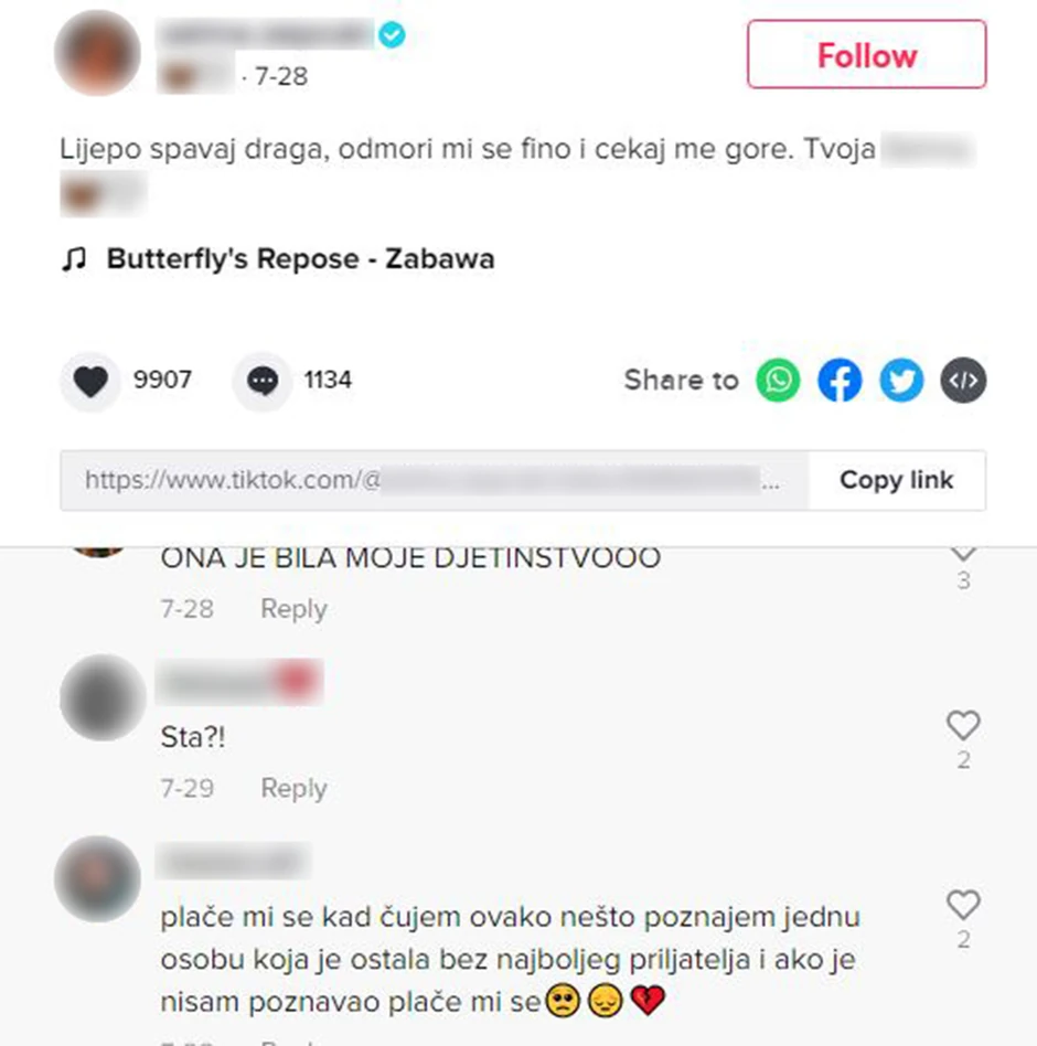 "Lepo spavaj draga, odmori se lepo i čekaj me gore", napisala je jedna drugarica M. G. koja je danima ranije objavljivala njihove zajedničke fotografije i snimke. Ispod te objave ređali su se zabrinuti komentari korisnika ove društvene mreže koju su se šokirali informacijom o samoubistvu mlade TikTok zvezde iz Crne Gore.