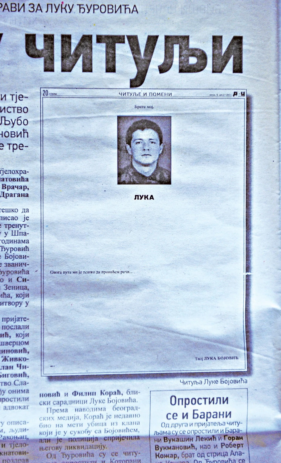 Među brojnim pomenima i poslednjim pozdravima za Baranina Luku Đurovića (34), koji je pre pet dana poginuo u teškoj saobraćajnoj nesreći u Kotoru, a koji su u podgoričkom listu „Dan“ objavljeni na rekordnih 25 stranica, nalazi se i čitulja koju je dao Beograđanin Luka Bojović (40) zvani Pekar. Bojović, koji se trenutno nalazi u pritvoru u Španiji, u čitulji objavljenoj na celoj strani napisao je „Brate moj... Ovog puta mi je teško da pronađem reči. Tvoj Luka Bojović“.