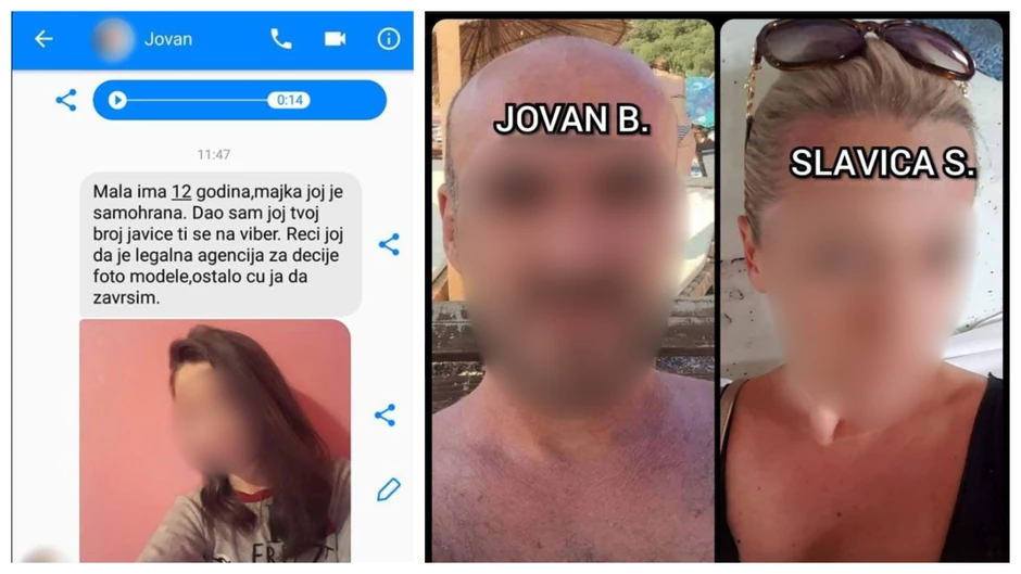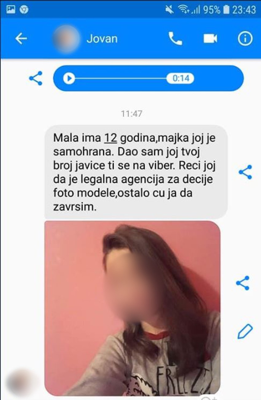 „Mala ima 12 godina, majka joj je samohrana. Dao sam joj tvoj broj javiće ti se na Viber. Reci joj da je legalna agencija za dečje foto-modele, ostalo ću ja da završim”, napisao je Jovan B. Slavici S. uz fotografiju maloletnice.