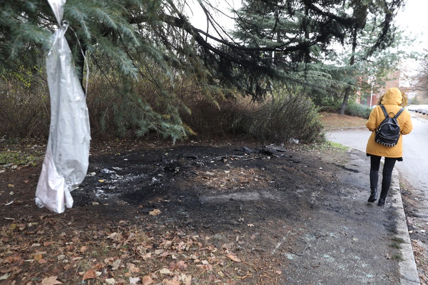 Dan kasnije, na mestu gde je sinoć goreo automobil, između Medicine rada i vrtića u Omladinskih brigada na Novom Beogradu, vide se ostaci paljevine. Garež, delovi automobila koji je goreo, staklo rasuto po trotoaru i ugljenisana krošnja gde je vozilo bilo parkirano.