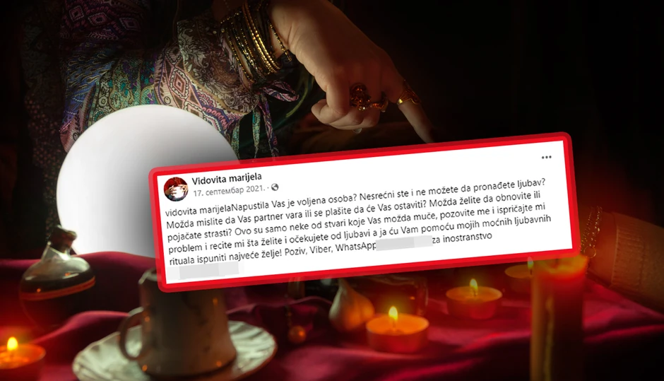 "Napustila vas je voljena osoba? Nesrećni ste i ne možete da pronađete ljubav? Možda mislite da vas partner vara? Pozovite me i ispričajte mi problem i recite šta očekujete od ljubavi, a ja ću vam pomoću mojih moćnih ljubavnih rituala ispuniti najveće želje...", piše u oglasu na Fejsbuku iza koga se kriju prevaranti. Protiv jednog od njih, D. N. (25), pre tri dana je podignuta optužnica zbog sumnje da je u novembru 2020. godine od žene iz Smedereva uzeo zlato i novac u vrednosti od 120.000 dinara obećavajući joj da će skinuti crnu magiju koju je, kako joj je tvrdio, bačena na njenog sina.
