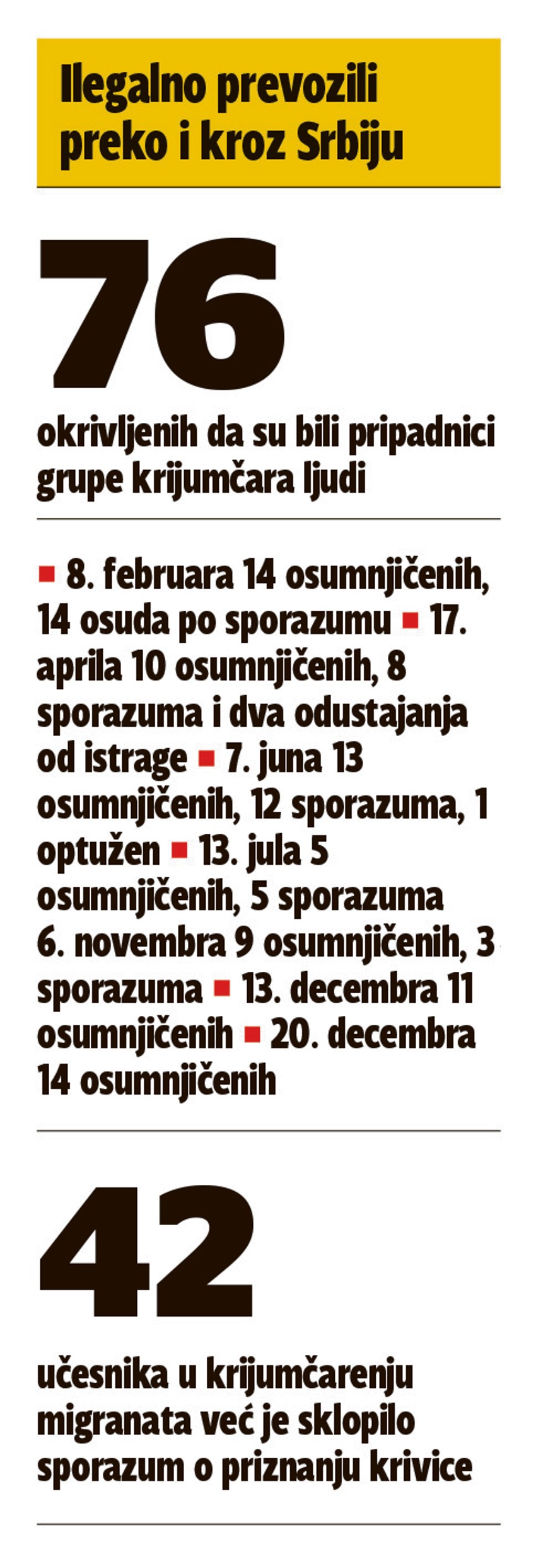Osumnjičenima se stavlja na teret da su od 23. marta do 12. juna 2017, na teritoriji Dimitrovgrada, Niša, Aranđelovca i Beograda, u osam tura 119 migranata ilegalno prebacili preko granica Srbije. Za uslugu prihvata migranata u blizini granice Srbije i Bugarske, tranzit kroz Srbiju, kao i ilegalni prelaz granice Srbije i Mađarske, pripadnici kriminalne grupe naplaćivali su oko 280 evra po jednom migrantu. Dalji put iz Srbije je bio moguć tek kada migrant isplati ukupnu sumu, a svaku provedenu noć u Srbiji su plaćali 10 evra po osobi.