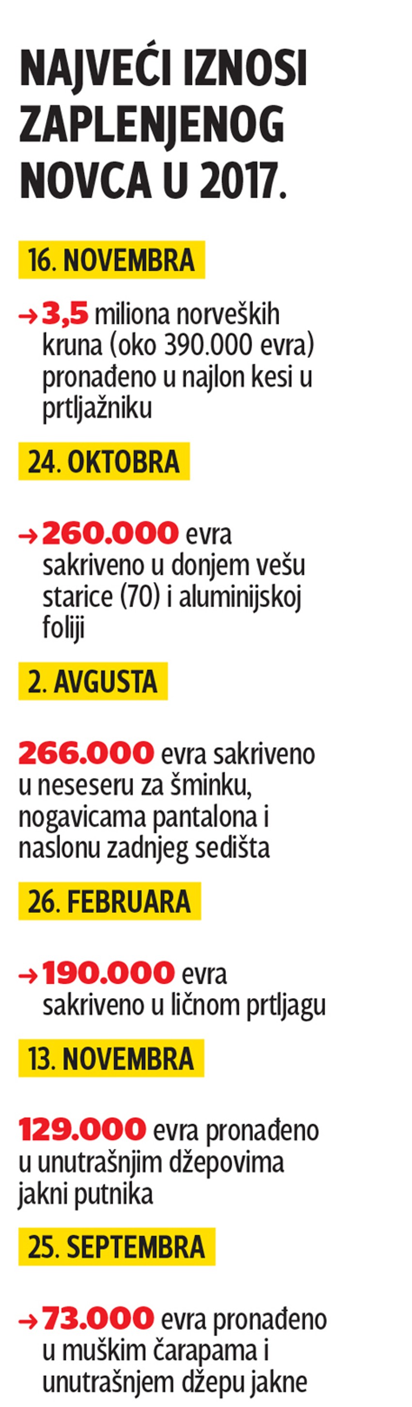 - Nisu još gotovi bilansi, ali je do novembra sigurno zaplenjeno više od četiri miliona evra. Ima putnika koji, slučajno ili namerno, čine devizni prekršaj tako što ne prijavljuju da sa sobom nose više od 10.000 evra. Time oni krše Zakon o deviznom poslovanju i Zakon o sprečavanju pranja novca i finansiranju terorizma, tako da mi privremeno oduzimamo te devize i prekršioce predajemo sudu koji ovakve prekršaje najčešće kažnjava novčanom kaznom i trajnim oduzimanjem iznosa otkrivenog u prekršaju. Pitanje koje se postavlja je - za šta se taj novac zapravo koristi? Niko ne bi svesno kršio propis koji je dobro poznat, niti bi rizikovao da mu tako velika suma novca bude oduzeta da su tu baš sasvim čista posla - navodi Lazarevićeva.