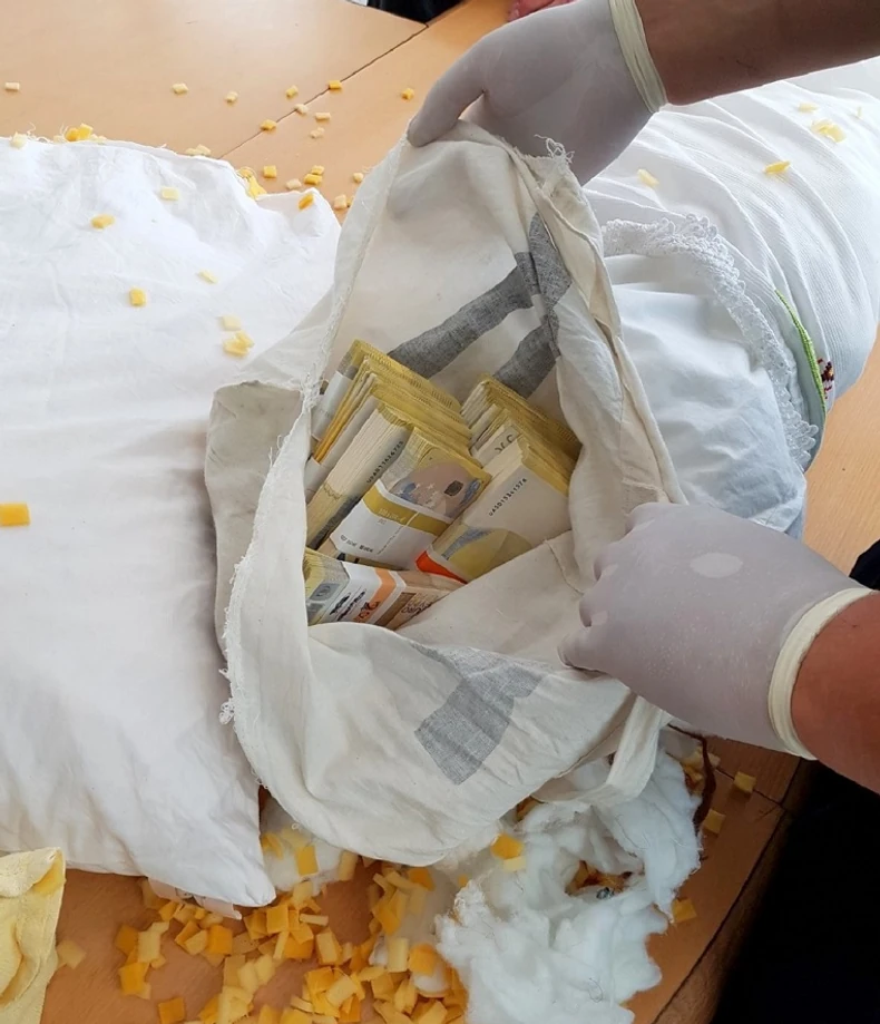 Tada je 31-godišnja žena uzela iz automobila dva jastuka da bi navodno sela na njih. Pre nego to je to učinila, carinik je zatražio da pogleda jastuke i u njima pronašao gomilu novca.