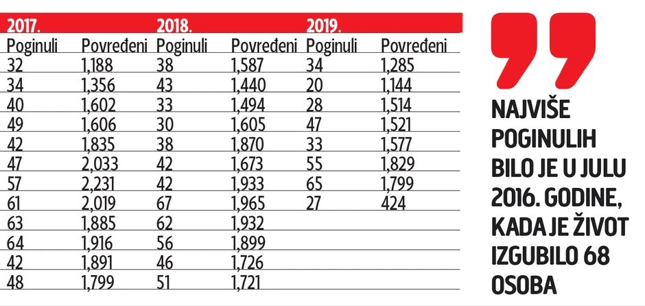 Uzimajući u obzir isključivo mesec jul, on jeste ove godine bio najcrnji u odnosu na 2018. i 2017. godinu, dok je broj nastradalih bio veći tokom jula 2016, 2013, 2012, 2009. (pogledaj tabelu). Broj poginulih u saobraćajnim nesrećama tokom jula posebno je zabrinuo pred ulazak u avgust, koji je tradicionalno najopasniji mesec na putevima.