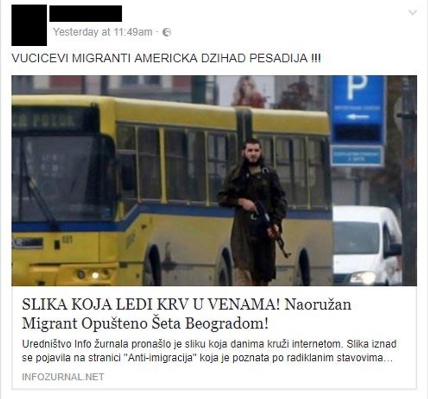 Huškačka objava protiv migranata izvučena je daleko od svog konteksta, vremena i mesta, pa je na Fejsbuku počela masovno da se širi vest sa naslovom "Naoružan migrant opušteno šeta Beogradom", i fotografijom na kojoj se vidi gradski autobus, sličan onima u Beogradu, a koja je isečena baš na mestu gde stoji registarska tablica BiH.