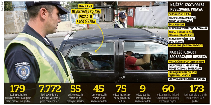 Poražavajuću statistiku da tek svaki deseti putnik na zadnjem sedištu vozila u Srbiji koristi pojas potvrdila je juče i patrola "Blica" sa saobraćajnom policijom.