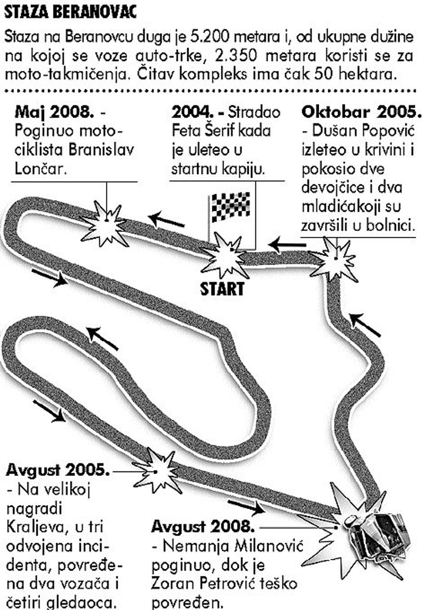 Nemanju je na stazi u nedelju po podne „jugom“ pokosio Damir Ilić iz Sremskih Karlovaca, koji je vozio trku u „nacionalnoj klasi“. Ilić je sa staze izleteo pred krivinom broj osam, u momentu kada se nekoliko vozača borilo za poziciju na 32. šampionatu Srbije. Udario je u „juga“, koji je posle kvara ostao parkiran pored staze. Milanović i Petrović su u tom momentu bili oslonjeni na parkirano vozilo, nekoliko metara ispred žute trake, koja gledaoce odvaja od staze. Milovanović je umro po prijemu u bolnicu, dok je Petroviću u udaru povređena kičma i polomljena butna kost. U nesreći, vozaču Iliću je prelomljena nadlaktica leve ruke. On je juče zatražio da se utvrdi odgovornost za nesreću