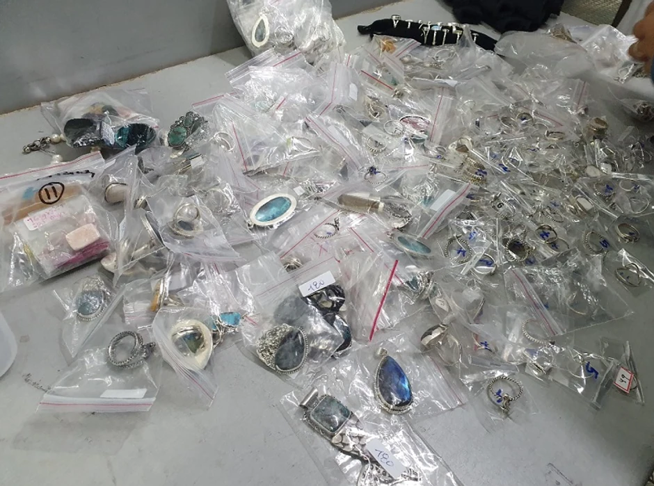 Tada je utvrđeno da je kofer pun srebrnog prstenja, ogrlica, narukvica, privezaka, koji su bili zapakovani u posebne vrećice, spremni za prodaju, kao i pločica, alata i raznog poludragog kamenja, pa je ukupna vrednost prekršaja procenjena na gotovo 6.000 evra.