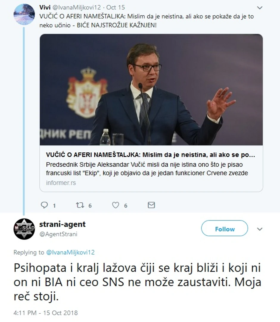 "Vučiću Aleksandre, tvoj strah od mene (nas @TheMošadIL) je naravno opravdan. Svakoga sekunda dok lično ne stanem pred tebe, ivi u strahu - kako si sudio biće ti suđeno. Moja reč stoji", pie u drugom tvitu.
