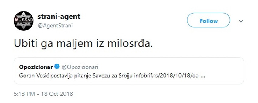 Kako smo pisali juče pretnje su bile upućene sa profila @AgentStrani, a da je korisnik koji stoji iza njega Đuro Trkulja.