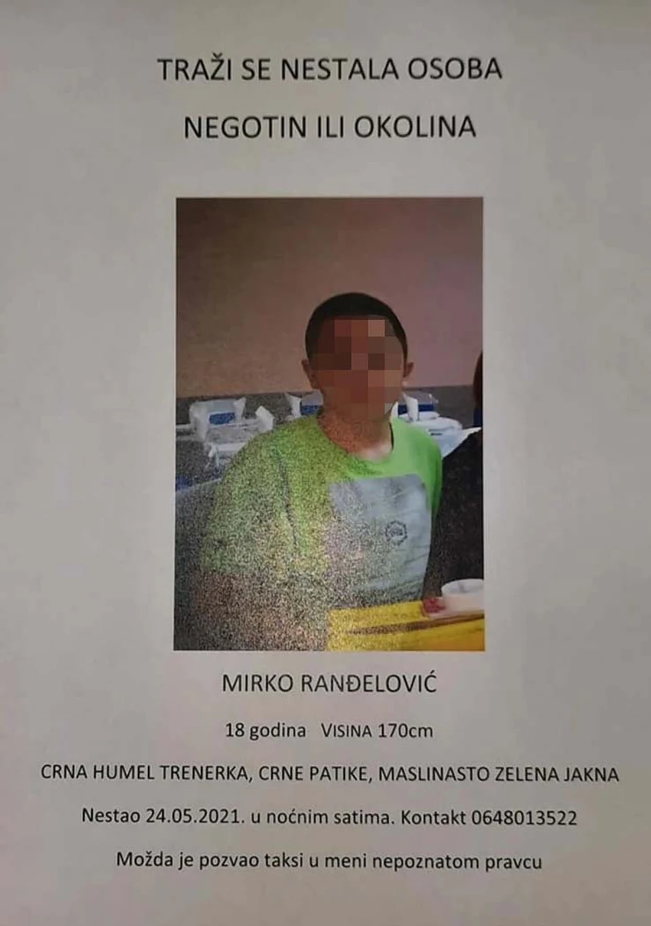 M. R. je nestao u večernjim satima u Negotinu. Sumnjalo se i da je dana kada je nestao, pozvao taksi u nepoznatom pravcu, a nestao je u večernjim satima, piše Telegraf.