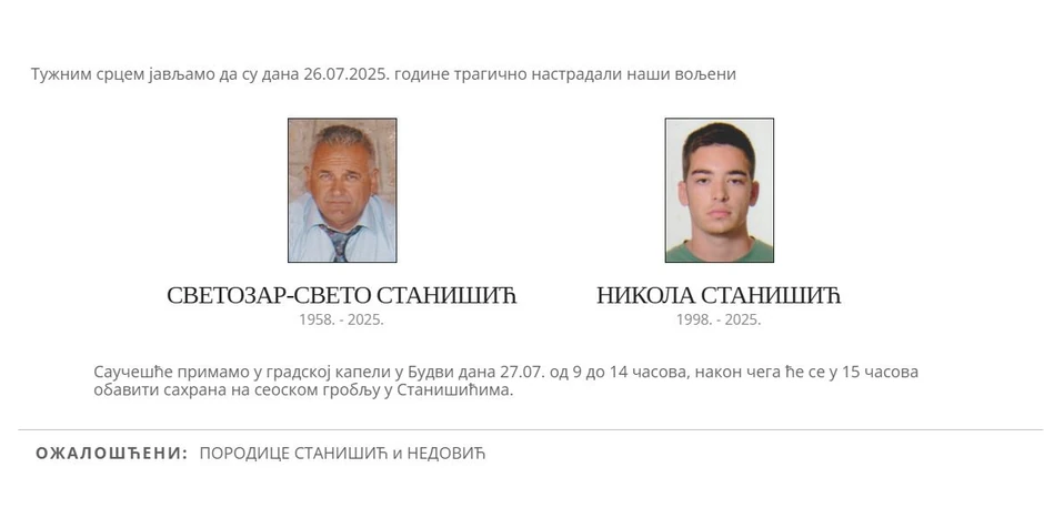 - Tužnim srcem javljamo da su dana 26.jula 2025. godine tragično nastradali naši voljeni Svetozar Sveto Stanišić i Nikola Stanišić. Saučešće primamo u gradskoj kapeli u Budvi 27. jula od 9 do 14 časova, nakon čega će se u 15 časova obaviti sahrana na seoskom groblju u Stanišićima - piše u čitulji koju su objavile porodice Stanišić i Nedović.