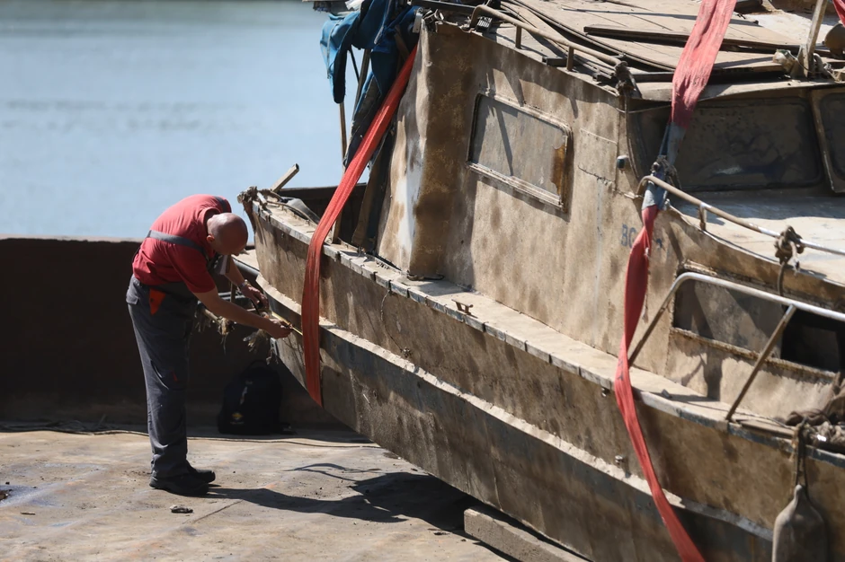 Iz Save na Novom Beogradu je juče izvučen čamac i stavljen na baržu.