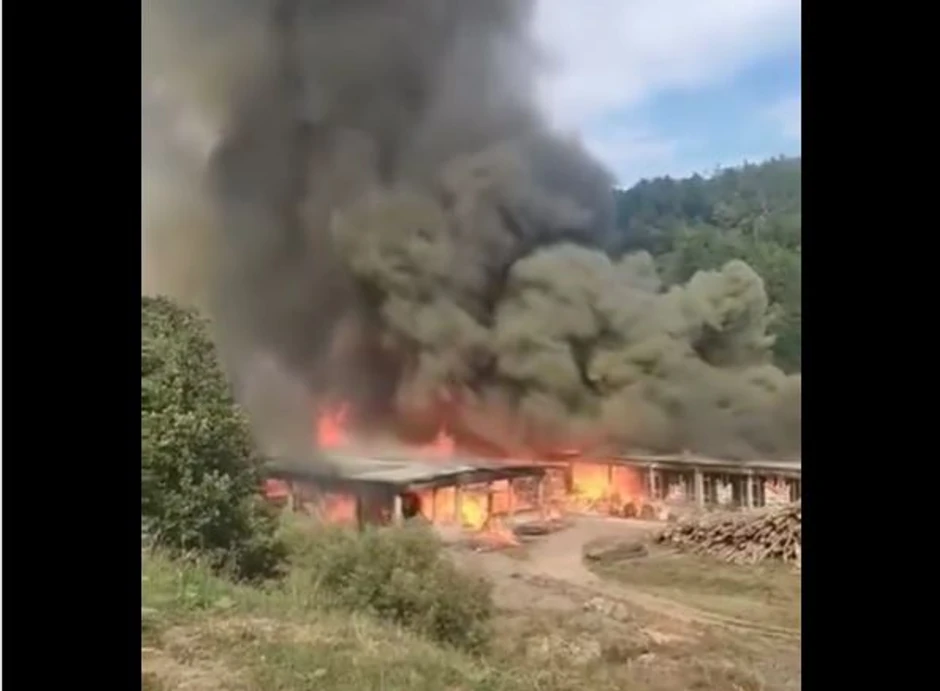 Kako se može videti na snimku objavljenom na društvenim mrežama, ogroman požar preti da zahvati celu fabriku, vatra nezaustavljivo guta ceo objekat, a gust crni dim kulja u nebo.