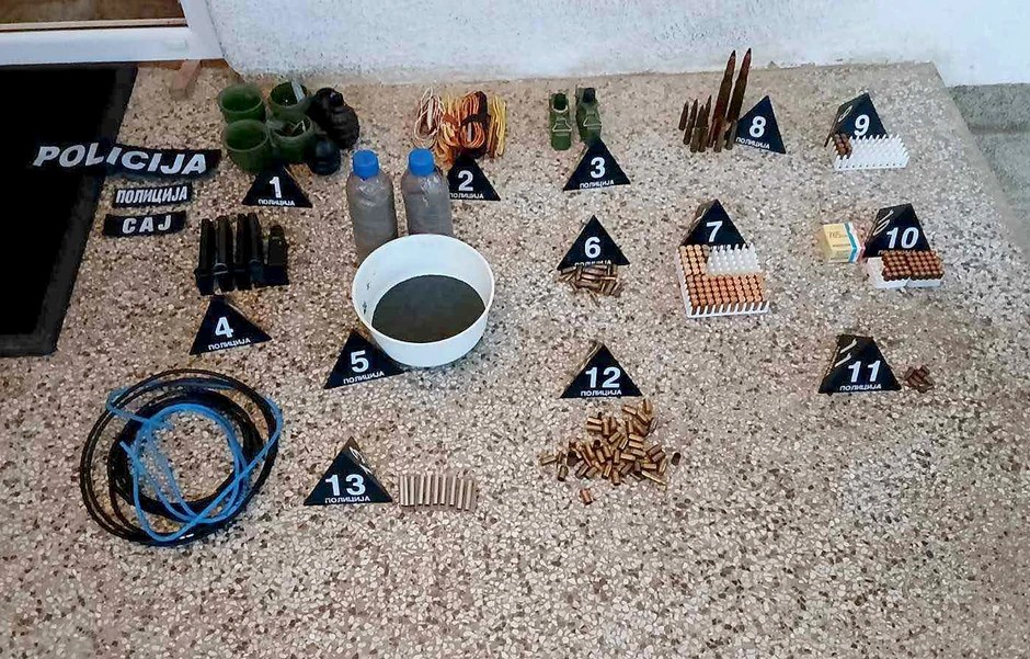 Oduzeti predmeti uključuju ručne bombe, municiju, policijske oznake i vojnu opremu.