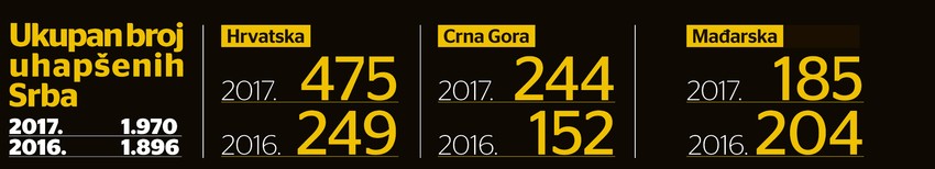 Posle Hrvatske, država u kojoj najčešće hapse državljane Srbije je Crna Gora, a u nekada bratskoj republici prošle godine su privedena 244 Srbina. Jedino se među susede umešala, i to na treće mesto "ubacila", Savezna Republika Nemačka, gde je prošle godine prijavljeno hapšenje 204 naša državljanina, a zatim sledi Mađarska, čija policija je privela 185 osoba sa srpskim pasošem.
