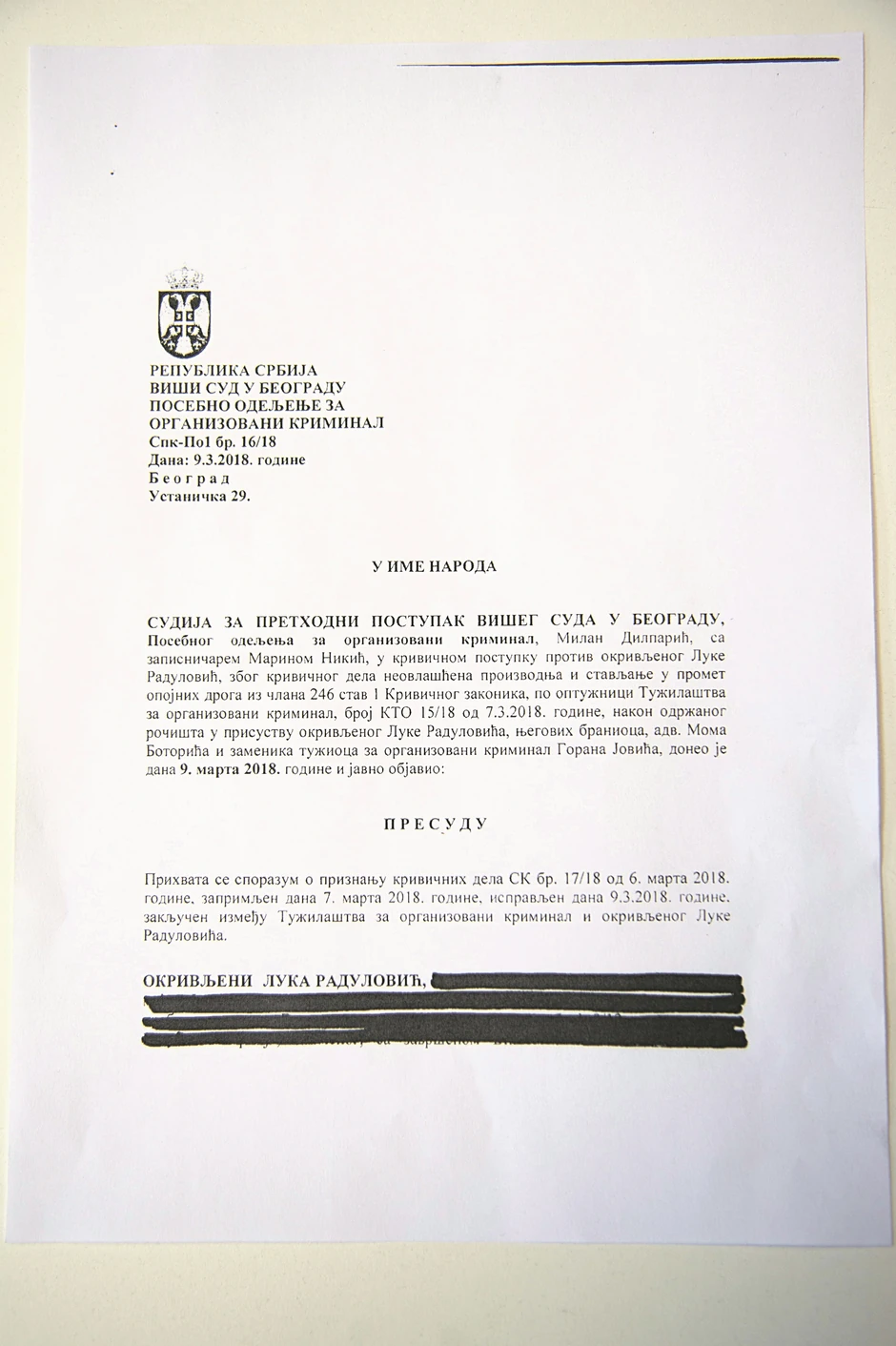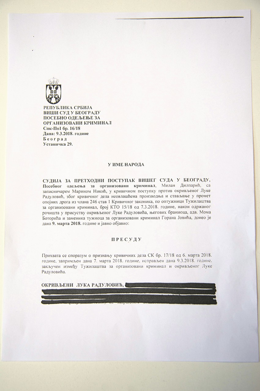 "Blic" je po zahtevu o slobodnom pristupu informacijama dobio presudu Specijalnog suda od 9. marta protiv Radulovića po sporazumu o priznanju krivice sačinjenom tri dana ranije. Ova presuda može da se koristi kao dokaz protiv Radulovićevih saučesnika koje je on spominjao.