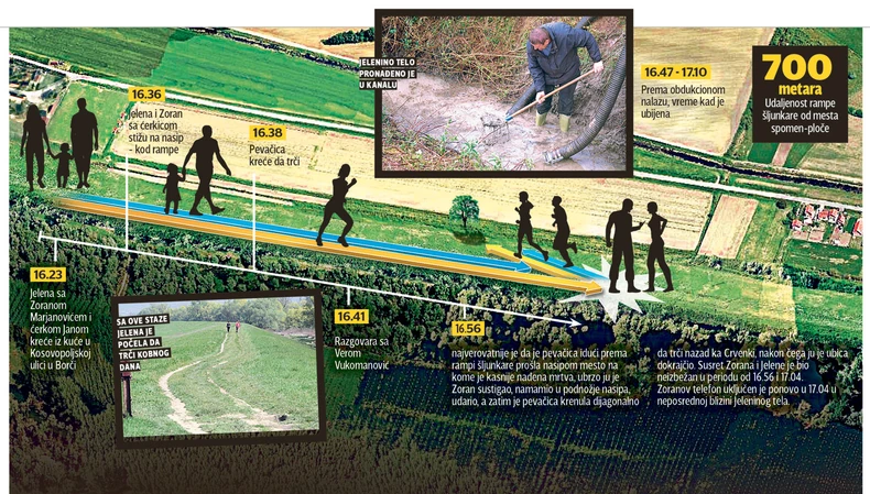 U vreme koje je u optužnici označeno kao vreme ubistva, na nasipu je bila samo Jelenina i Zoranova ćerka Jana, koja je u tom momentu imala pet godina i koja je potvrdila priču svog oca, da se nije odvajala od njega, čemu tužilaštvo "nije poklonilo veru". Tužilaštvu u korist ide iskaz bicikliste koji je u vreme zločina, koje je navedeno u optužnici, bio na nasipu. On je ispričao da je "video muškarca i ženu kako se spuštaju niz nasip" i detaljno opisao njihovu garderobu.