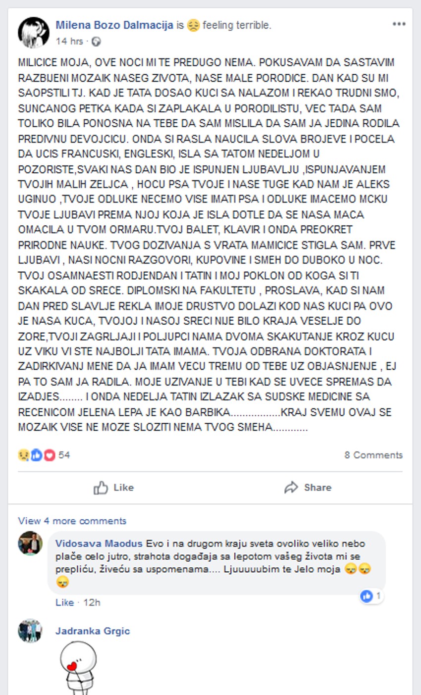 "Miličice moja, ove noći mi te predugo nema. Pokušavam da sastavim razbijeni mozaik našeg života, naše male porodice. Dan kad su mi saopštili, tj. kada je tata došao kući sa nalazom i rekao trudni smo, sunčanog petka kada si zaplakala u porodilištu, već tada sam toliko bila ponosna na tebe da sam mislila da sam ja rodila poredivnu devojčicu", reči su kojima roditelji Milene Dalmacije započinju svoju tužnu objavu na godišnjicu smrti njihove ćerke.