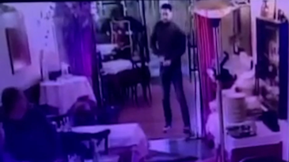 Kako se vidi na snimku sa nadzorne kamere koji snima izlaz iz lokala, muškarac obučen u crnu rolku i crne farmerke podiže pištolj i puca.