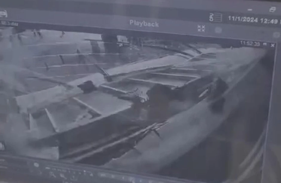 Na snimku se vidi i kako su pred sam pad popustile i čelične utege koje su držale nadstrešnicu. One se otkidaju od krova za koji su bile prikačene i, jednako kao i nadstrešnica, prvo popuštaju one sa desne strane, a potom i one sa leve.