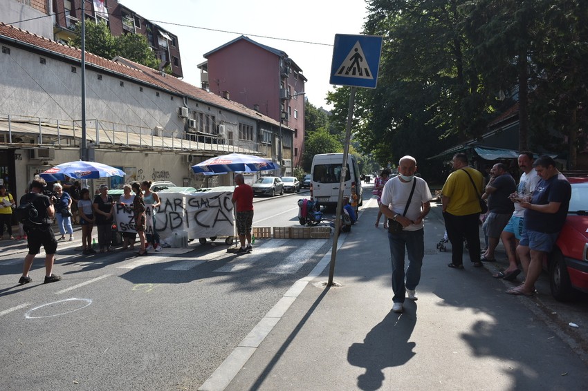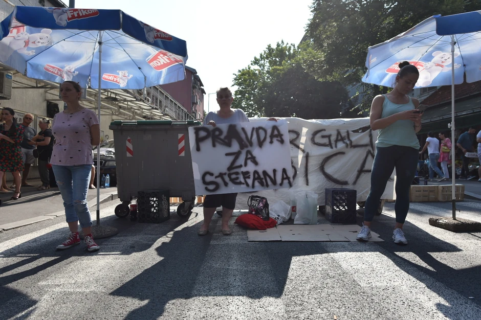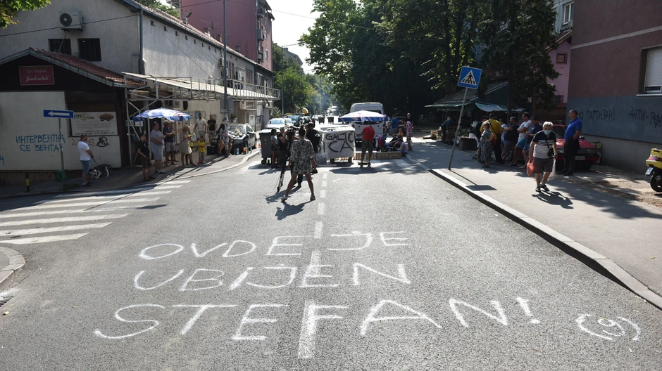Ulica Marijane Gregoran i tokom jutra je blokirana zbog protesta građana koji su se sinoć okupili na pešačkom prelazu gde je stradao devetogodišnji dečak Stefan B. kada je na njega, njegovog mlađeg brata L. B. (4) i njihovog oca u nedelju uveče naleteo Lazar G. (38), koji je potom pobegao sa mesta nesreće.