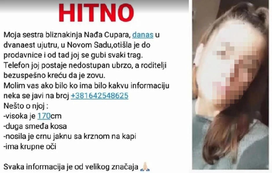 Ona je, podsetimo, juče otišla do prodavnice i od tada joj se gubi svaki trag, a telefon joj je ubrzo postao nedostupan. Potragu na mrežama organizovala je njena sestra bliznakinja.