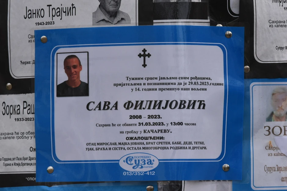 - Tužnim srcem javljamo svim rođacima, prijateljima i poznanicima da je 29. marta u 14. godini preminuo naš vođeni Sava Filijović - piše na umrlici mladića koji je juče skočio sa trećeg sprata kroz prozor osnovne škole u Kačarevu.