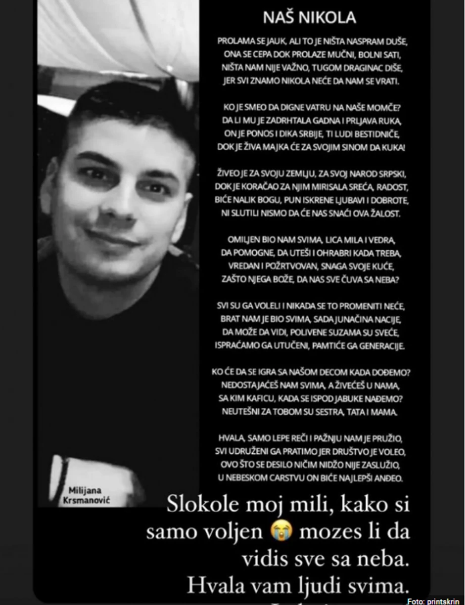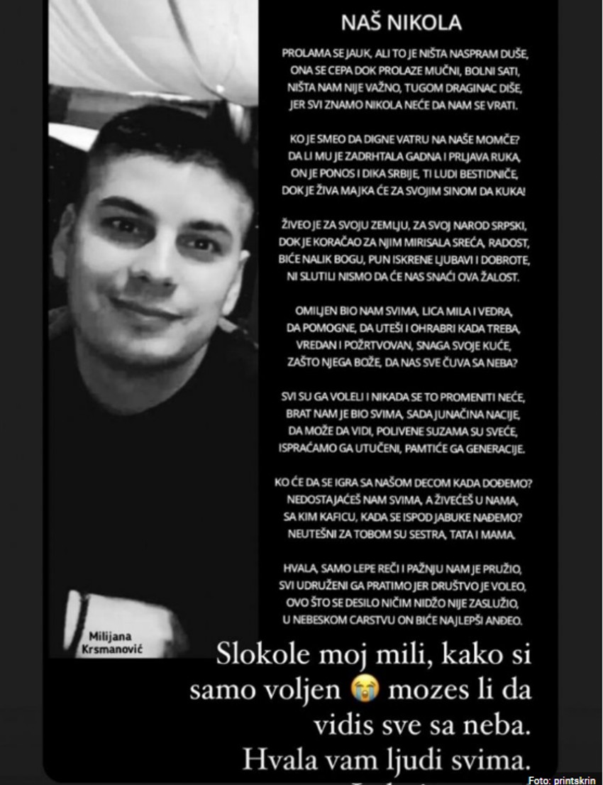 Samo nekoliko sati pre sahrane, rođena sestra Nikole Krsmanovića, Katarina, oglasila se na društvenoj mreži Instagram gde je objavila potresnu poruku za svog brata.