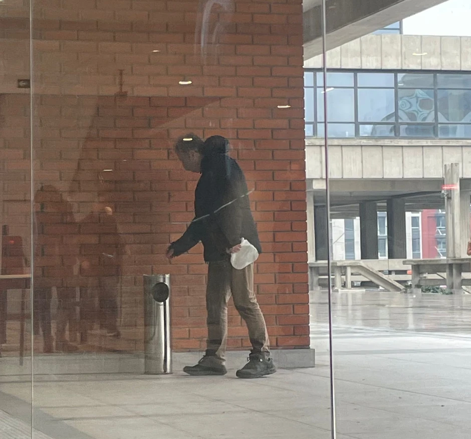 Otac ubijene Katarine Martinović došao je na suđenje Kecmanovićima nekoliko minuta pošto je počelo suđenje. Stao je ispred ulaza i čeka. U rukama drži kesu sa drvenom pločicom u obliku srca.