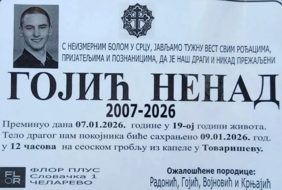"S neizmernim bolom u srcu, javljamo tužnu vest svim rođacima, prijateljima i poznanicima, da je naš dragi i nikad prežaljeni Gojić Nenad preminuo 7.1.2026.godine u 19-godini života. Telo dragog nam pokojnika biće sahranjeno 9.1.2026.godine u 12 časova na seoskom groblju iz kapele u Tovariševu", navodi se na umrlici.