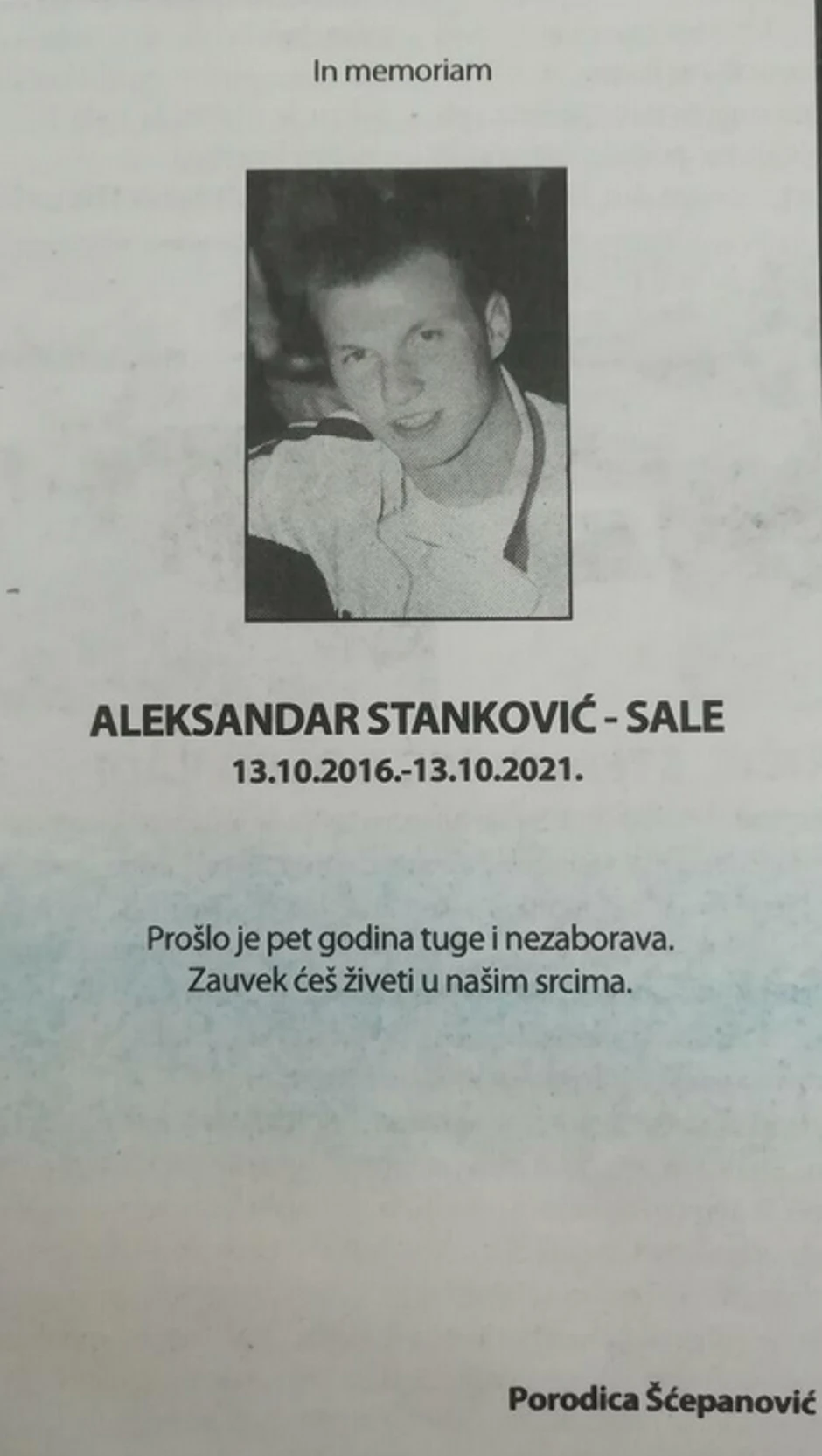 - Prošlo je pet godina tuge i nezaborava. Zauvek ćeš živeti u našim srcima - piše u čitulji koju je potpisala porodica Šćepanović.